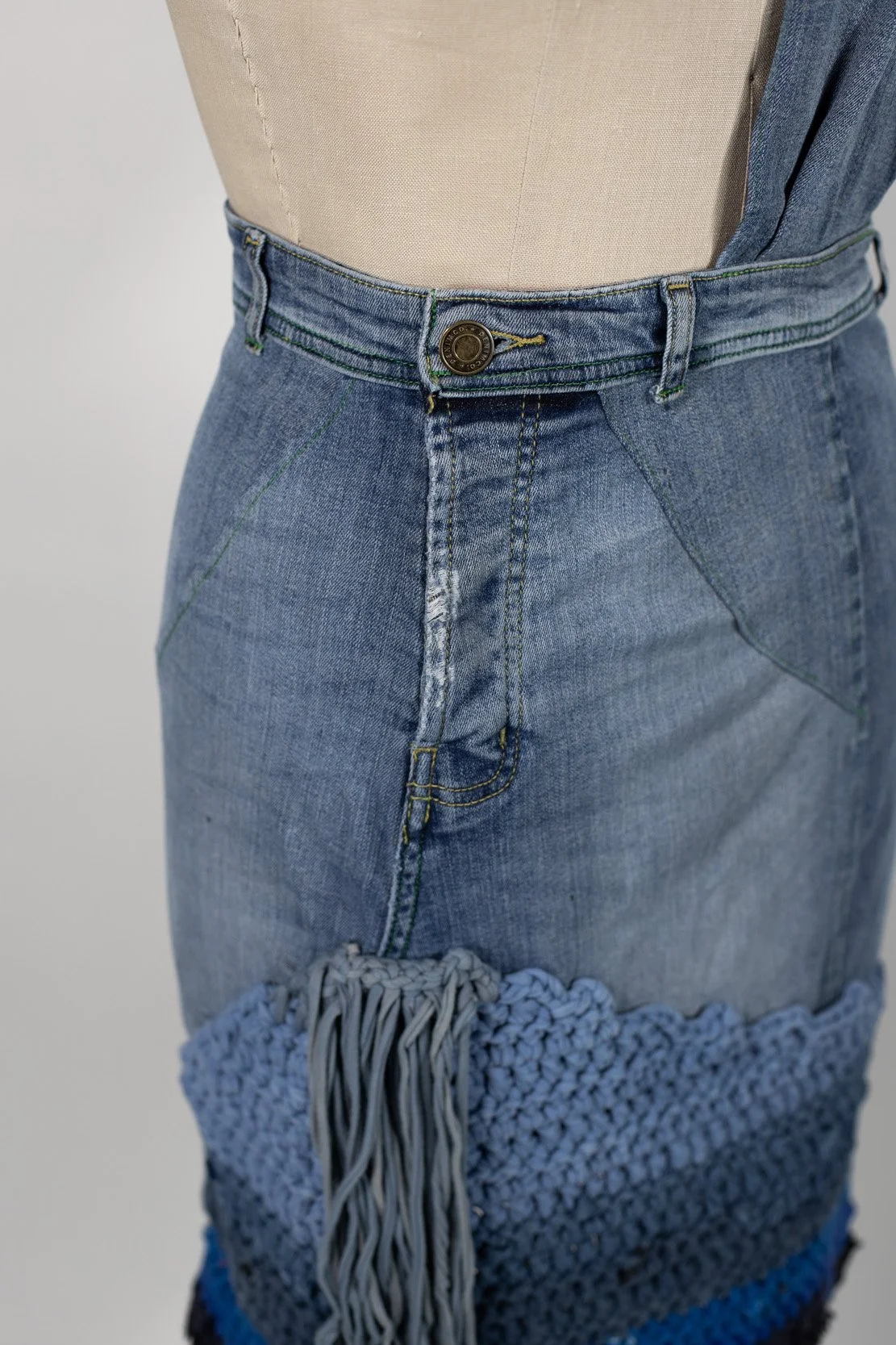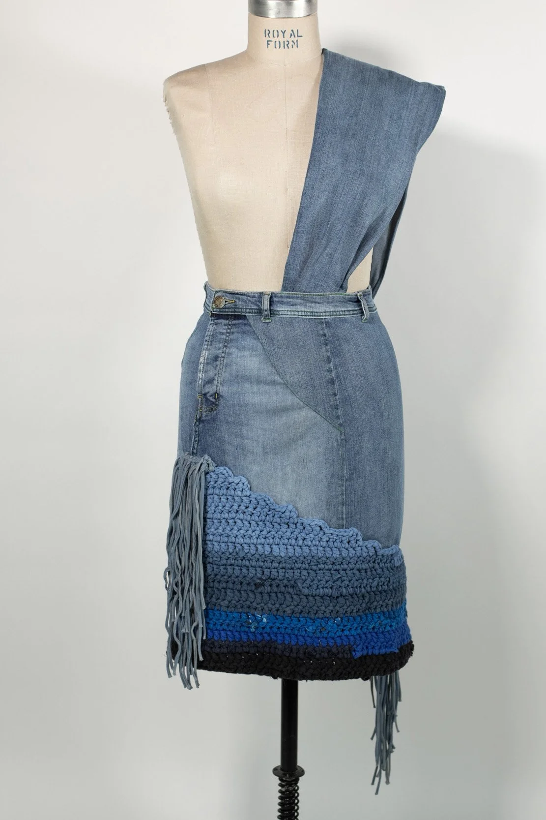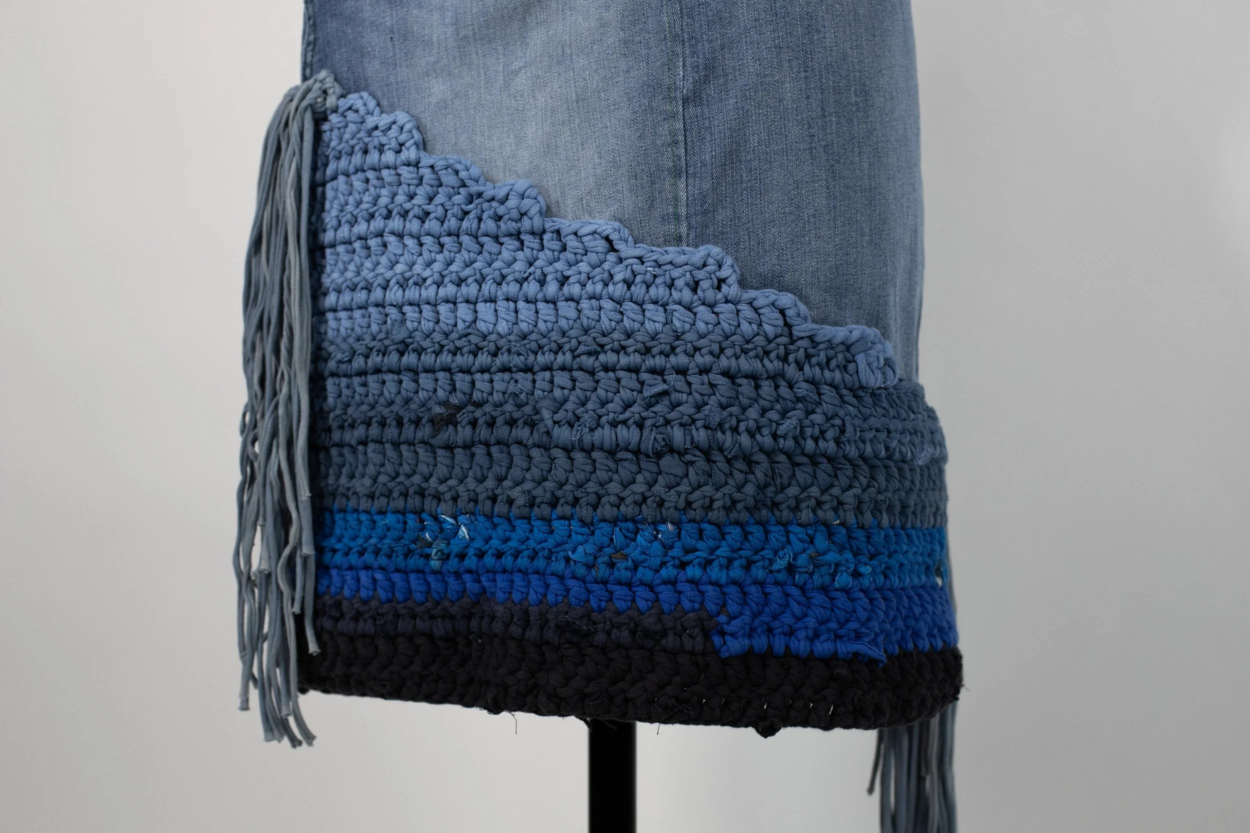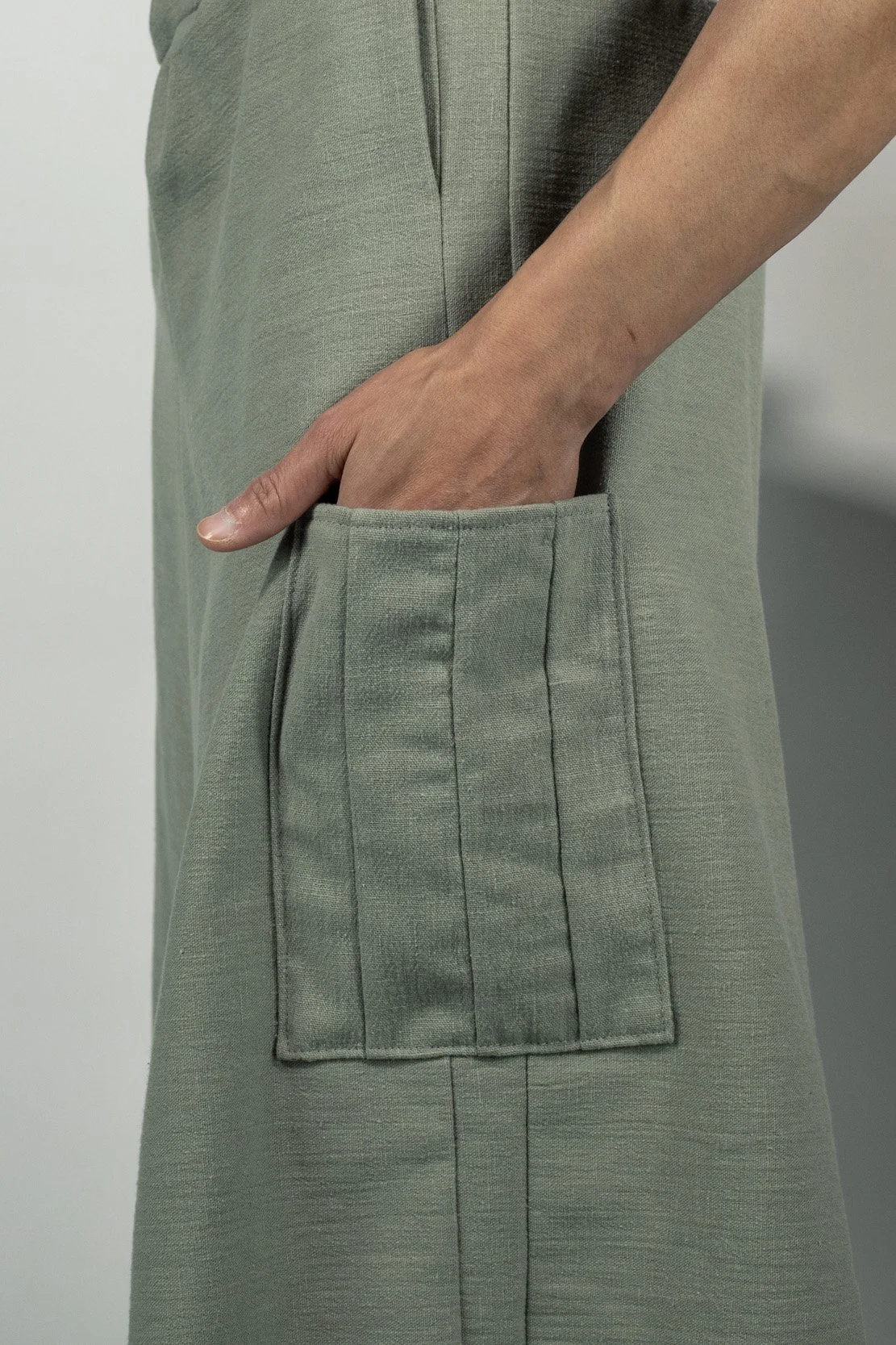 Zero waste design pants with 60s floral micro corduroy accent. Pockets, shadow folding and ties at waist. Waist is very adjustable with extra hook and bar at front sides and back sides. Can be worn with any variation connected. Loose fit and drapey with higher waist but dropped crotch.